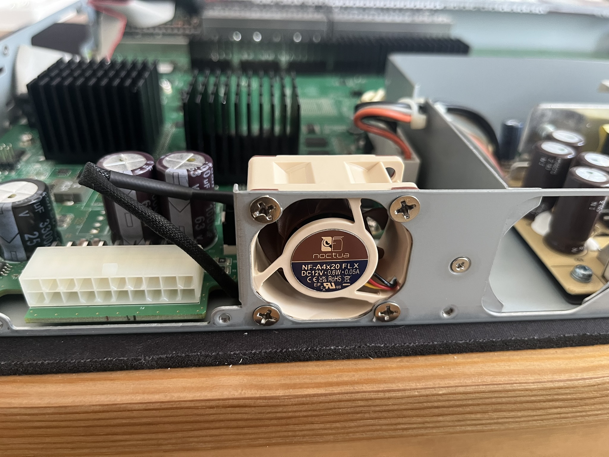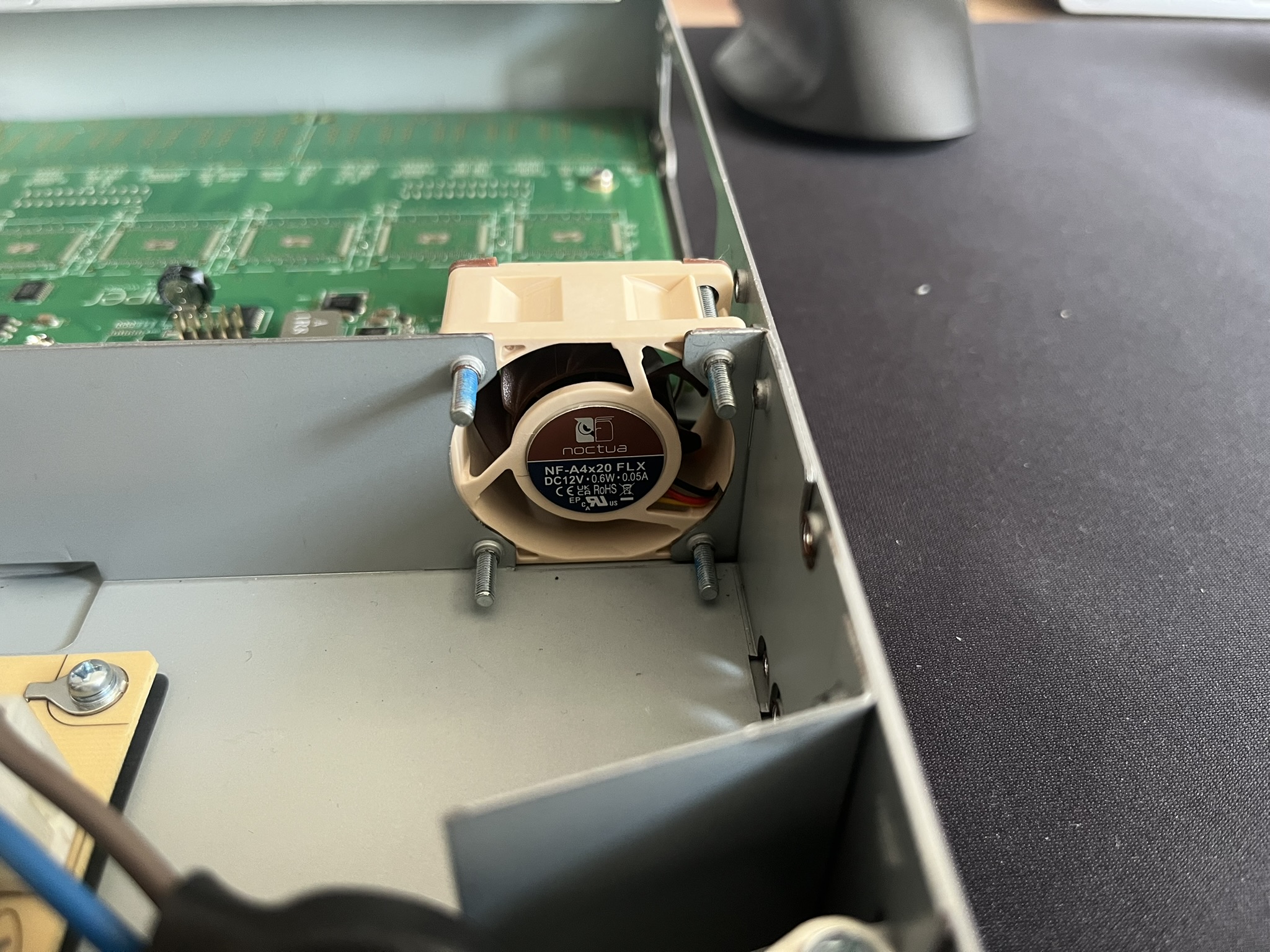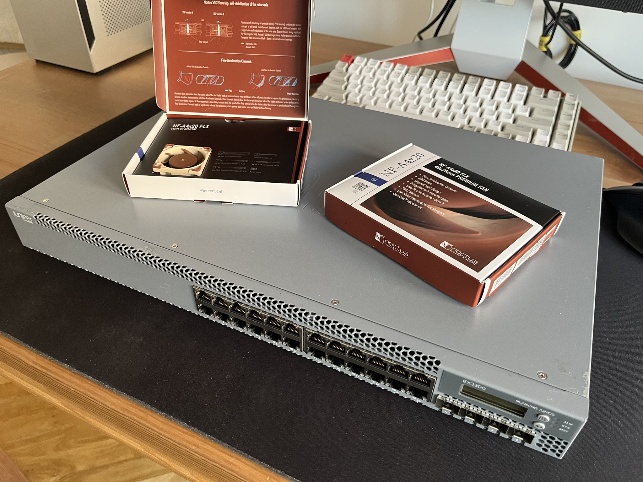 One downside, however, is the noise level—the EX3300 can be quite loud. To mitigate this, I replaced the stock fans with Noctua NF-A4x20 FLX models. This upgrade significantly reduced the noise while maintaining efficient airflow, making the switch much more suitable for a home lab environment.